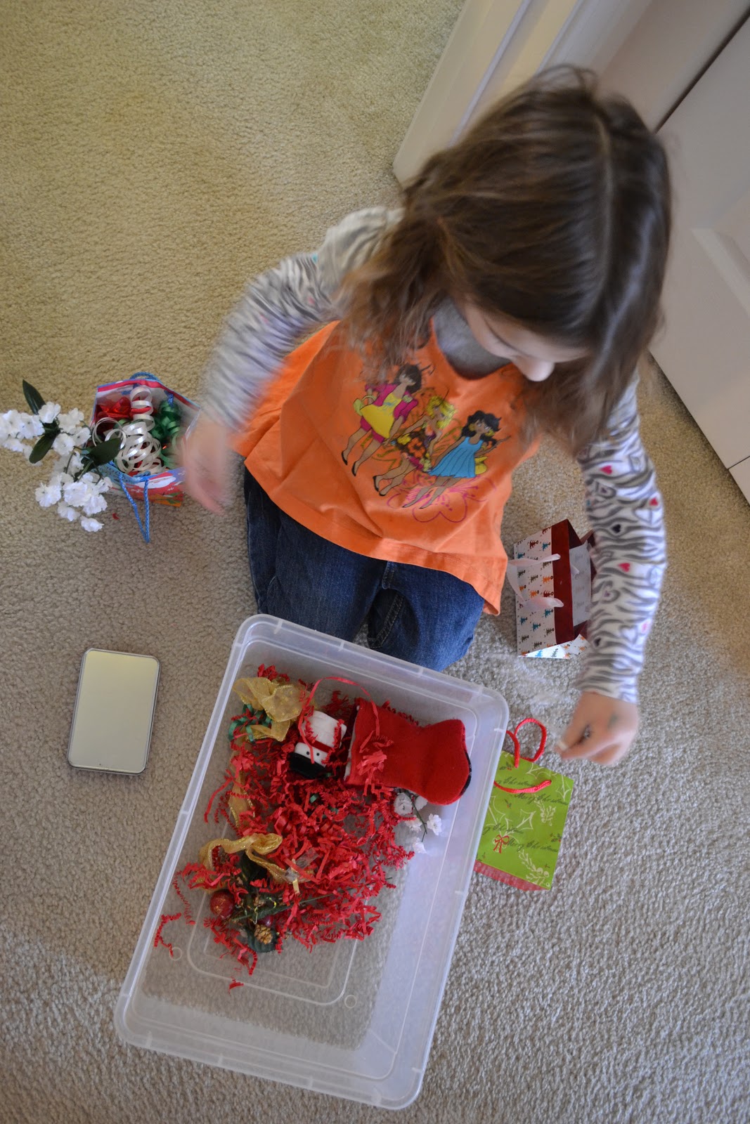 ...for Ana's adorable creativity. Somehow she turns sensory play into dramatic play every time. I don't even mind my landing being decorated as a fancy Christmas stage. Even the tree was decorated with ribbon and fanciness.